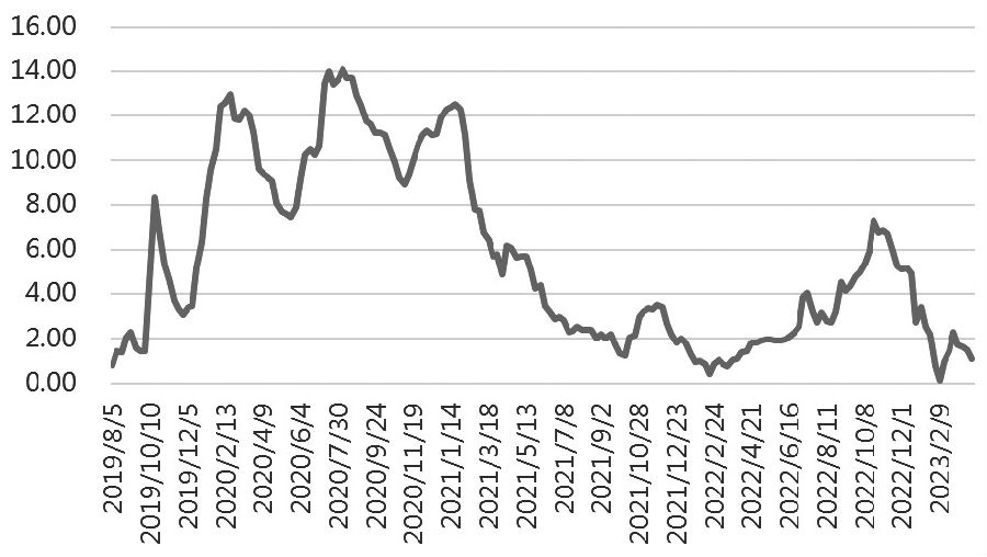 2022年10月下旬開始,2號肉鮮凍價差持續(xù)走低,并于2023年2月9日創(chuàng)近4年新低(0.14元/公斤)。春節(jié)后,凍品出現(xiàn)明顯的渠道補庫需求,鮮凍價差短時走高。隨著凍品補庫需求得到滿足,鮮肉消費卻持續(xù)低迷,實際的凍品消費(主要指加工產(chǎn)品消費)又處于正常狀態(tài),鮮凍價差繼續(xù)走低,截至4月6日當周,2號肉鮮凍價差為1.10元/公斤。