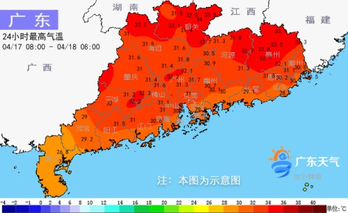 天氣實(shí)況:17日,廣東西部市縣多云間陰天,東部市縣晴到多云。由于云量增多影響,廣東大部分市縣的最高溫度較16日下降了1℃~5℃,大部介于26℃~33℃之間,其中韶關(guān)始興錄得全省最高溫度34℃。