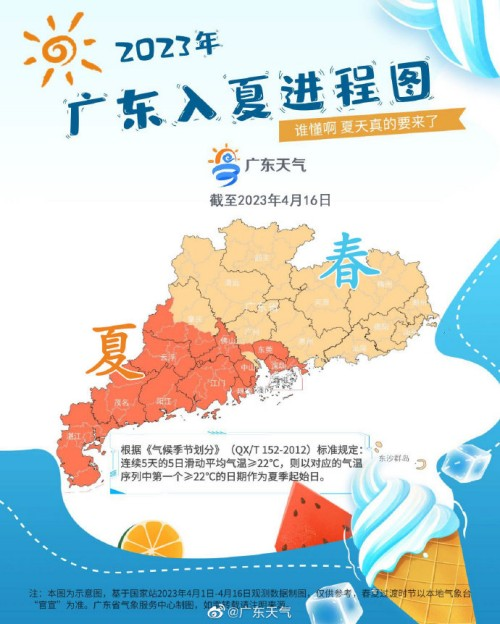 另外,根據(jù)氣候季節(jié)劃分標(biāo)準(zhǔn):連續(xù)5天的5日滑動平均氣溫序列≥22℃,則以對應(yīng)的氣溫序列中第一個(gè)≥22℃的日期作為夏季起始日。截至2023年4月16日,廣東全省86個(gè)市縣,有35個(gè)市縣已入夏,接下來還會有地方陸續(xù)入夏。