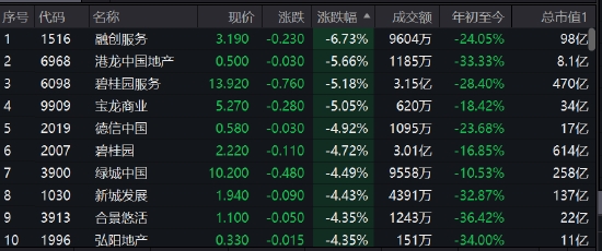 內(nèi)房股集體大跌,融創(chuàng)服務(wù)(3.19, -0.23, -6.72%)跌近7%,港龍中國地產(chǎn)(0.5, -0.03, -5.66%)、寶龍商業(yè)(5.27, -0.28, -5.04%)、碧桂園服務(wù)(13.92, -0.76, -5.18%)等跌超5%,德信中國(0.58, -0.03, -4.92%)、碧桂園等跌近5%。