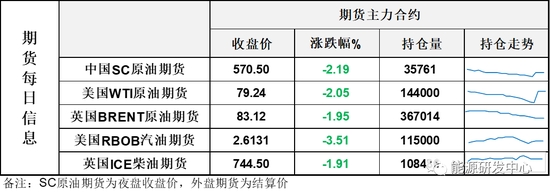 【1】WTI主力原油期貨收跌1.66美元,跌幅2.05%,報79.24美元/桶;布倫特主力原油期貨收跌1.65美元,跌幅1.95%,報83.12美元/桶;INE原油期貨收跌2.19%,報570.5元。
