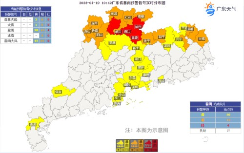 截至19日上午10:42時(shí),廣東有37個(gè)市縣發(fā)布暴雨預(yù)警信號(hào),其中4個(gè)市縣為暴雨紅色預(yù)警,13個(gè)市縣為暴雨橙色預(yù)警信號(hào)。另外還有68個(gè)市縣發(fā)布雷雨大風(fēng)預(yù)警信號(hào),8個(gè)市縣發(fā)布冰雹預(yù)警信號(hào)。