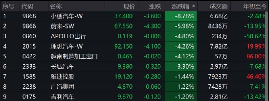 新能源汽車降價潮,汽車龍頭特斯拉公布一季度財報,凈利下滑20%,核心汽車毛利率跌至21.1%,今日新能源汽車在香港集體大跌,小鵬跌8.78%,蔚來跌近6%,理想汽車跌超4%,長城汽車(9.38, -0.32, -3.30%)跌超3%。