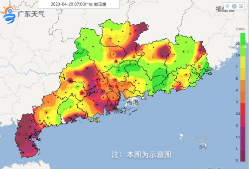 受云量增多和降水影響,19日白天,除肇慶、云浮、佛山、廣州、江門、陽江和茂名以外,其余大部分市縣的最高氣溫較18日下降了1℃~5℃;全省最高氣溫大部介于22℃~30℃,其中肇慶廣寧錄得全省最高氣溫30.4℃。19日夜間到20日早晨,廣東大部轉(zhuǎn)多云,最低氣溫介于19℃~23℃之間。另外,20日早晨,大部分市縣出現(xiàn)了輕霧,粵西和珠三角西部的部分市縣出現(xiàn)了能見度低于1公里的霧。