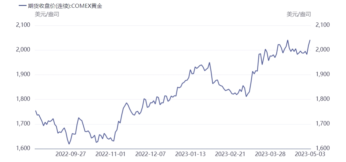 伴隨美聯(lián)儲(chǔ)的加息聲,國際現(xiàn)貨黃金價(jià)格大幅上漲,盤中刷新歷史新高至2076.2美元/盎司。截至北京時(shí)間5月4日17時(shí),現(xiàn)貨黃金價(jià)格回落至2035美元/盎司。截至記者發(fā)稿,現(xiàn)貨黃金今年漲幅達(dá)12.39%。