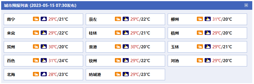 南寧市:今天白天到晚上,多云到陰天、局地有小雨,偏南風1~2級,最高氣溫29℃,最低氣溫21℃。