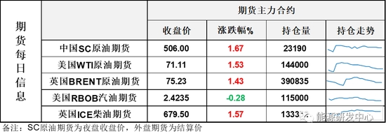 【1】WTI主力原油期貨收漲1.07美元,漲幅1.53%,報(bào)71.11美元/桶;布倫特主力原油期貨收漲1.06美元,漲幅1.43%,報(bào)75.23美元/桶;INE原油期貨收漲1.67%,報(bào)506元。