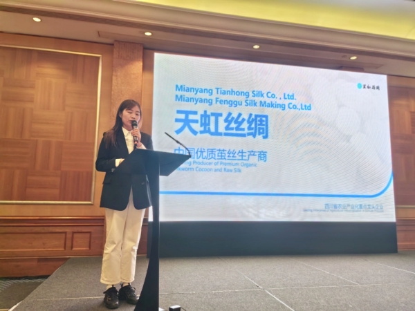 四川省9家農(nóng)業(yè)企業(yè)代表分別就各自的優(yōu)勢產(chǎn)品進行了推介,推介產(chǎn)品包括川桑、川茶、川酒、川果、川菜、川藥等,涵蓋了“飲食調(diào)養(yǎng)”等多個方面。會上,天虹絲綢總經(jīng)理薛憶圍繞公司高品質(zhì)農(nóng)業(yè)產(chǎn)業(yè)、有機蠶桑、可持續(xù)發(fā)展等議題作產(chǎn)品推介,獲得參會代表一致好評。17家四川農(nóng)業(yè)企業(yè)帶著各自農(nóng)產(chǎn)品進行了展示展覽。天虹公司生產(chǎn)的“涪城蠶繭”、S58精品生絲吸引了英方嘉賓的濃厚興趣。