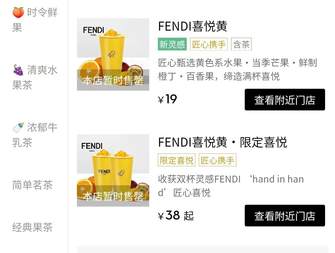 這杯聯(lián)名奶茶,背身采用標(biāo)志性的FENDI黃,再印有品牌LOGO,但只有19塊,真不貴。查了下工作附近的店,又隨便查了北京上海的店。售罄,沒有二話。