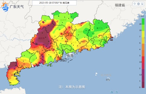 具體預(yù)報(bào):18日,粵北和珠江三角洲市縣多云間陰天,有中(雷)雨,局部大雨或暴雨,其余市縣多云,有分散(雷)陣雨局部大雨。最高氣溫:粵西和珠江三角洲市縣32℃~35℃,其余市縣29℃~32℃。