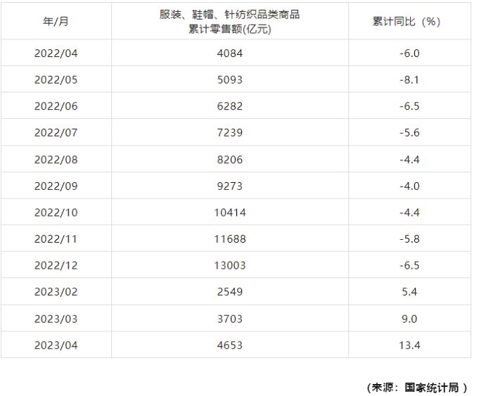 下圖為自2022年4月至2023年4月我國(guó)服裝、鞋帽、針紡織品類商品零售額。