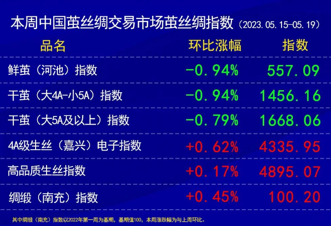 今日(2023年05月19日,周五)中國(guó)繭絲綢交易市場(chǎng)生絲指數(shù)微跌0.02%收于4335.95點(diǎn),本周生絲指數(shù)上漲0.62%。B絲(商檢4A級(jí)生絲):230525合約下跌0.06萬(wàn)元報(bào)收于43.17萬(wàn)元;230925合約報(bào)平收于43.38萬(wàn)元;240325合約下跌0.03萬(wàn)元報(bào)收于43.44萬(wàn)元。