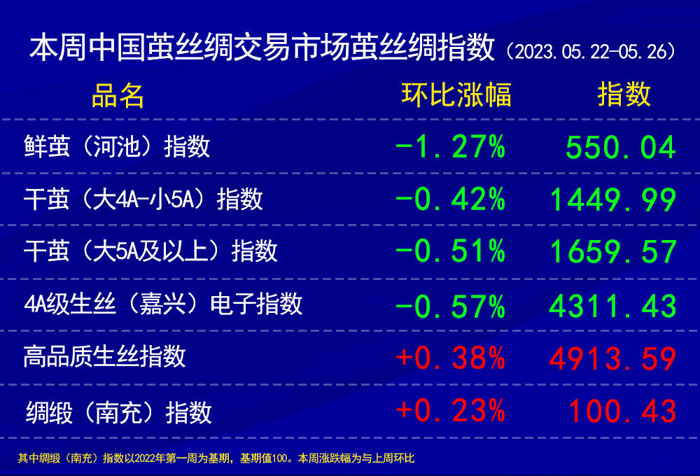 本周繭絲綢指數(shù)略漲跌不一(20230526)