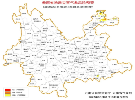 2023年06月01日20:00~06月02日20:00,昭通市綏江縣、水富市、鹽津縣、彝良縣發(fā)生滑坡泥石流的風(fēng)險高;昭通市北部、東北部,紅河州東南部發(fā)生滑坡泥石流的風(fēng)險較高。