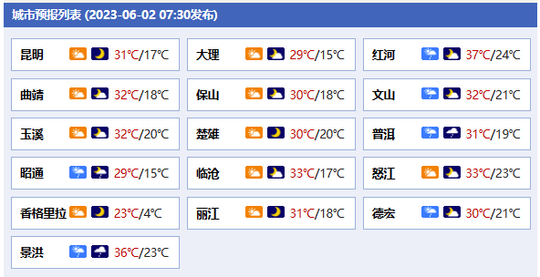 06月02日20時到06月03日20時:昭通東北部、曲靖東北部、紅河西南部、普洱東南部、西雙版納東部多云間陰有小到中雨,昭通西部、曲靖大部、文山、昆明東部、紅河大部、普洱南部、西雙版納西部、德宏西部、怒江北部多云有陣雨局部中雨,其它地區(qū)晴間多云。