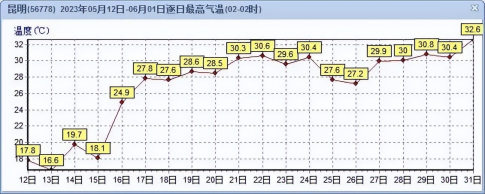 春城昆明,截止昨天5月最后一天已連續(xù)4天破30℃大關(guān),今年昆明氣溫30度以上共計9天均在5月!(昨天32.6℃)