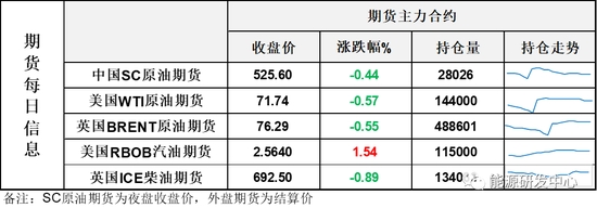 【1】WTI主力原油期貨收跌0美元,跌幅0.57%,報(bào)71.74美元/桶;布倫特主力原油期貨收跌0.42美元,跌幅0.55%,報(bào)76.29美元/桶;INE原油期貨收跌0.44%,報(bào)525.6元。