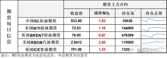 【1】WTI主力原油期貨收漲0.79美元,漲幅1.1%,報(bào)72.53美元/桶;布倫特主力原油期貨收漲0.66美元,漲幅0.87%,報(bào)76.95美元/桶;INE原油期貨收漲1.93%,報(bào)533.8元。