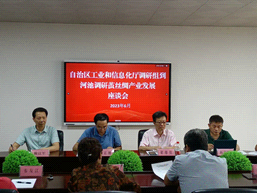 河池市和宜州區(qū)工信局等相關(guān)部門領(lǐng)導(dǎo)、廣西繭絲綢行業(yè)協(xié)會會長賴以軍、河池市繭絲綢行業(yè)協(xié)會會長梁文軍、廣西恒業(yè)絲綢集團(tuán)有限公司董事長陸正耀、廣西桂華絲綢有限公司董事長盧受坤、廣西嘉聯(lián)絲綢股份有限公司董事長唐映珊、廣西宜州市宏基繭絲有限公司董事長韋友江、賓陽縣繭絲工貿(mào)有限責(zé)任公司董事長黃軍昭、同益新公司副總經(jīng)理張睿和宜州冠華絲綢印染項目負(fù)責(zé)人楊長志等參加座談會。