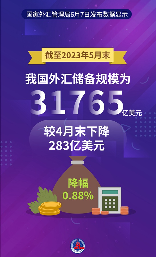 國家外匯管理局7日發(fā)布數(shù)據(jù)顯示,截至2023年5月末,我國外匯儲備規(guī)模為31765億美元,較4月末下降283億美元,降幅為0.88%。