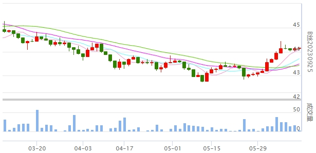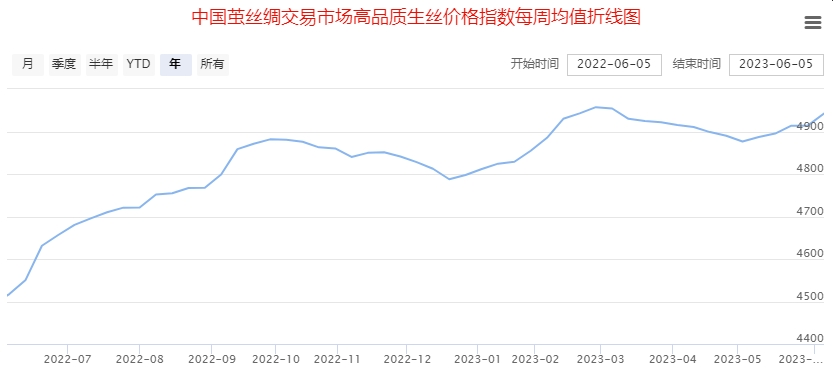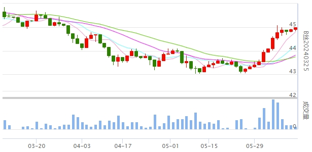 今日(2023年06月09日,周五)中國繭絲綢交易市場生絲指數(shù)微漲0.06%收于4421.26點,本周生絲指數(shù)上漲0.94%。B絲(商檢4A級生絲):230625合約報平收于43.92萬元;230925合約上漲0.03萬元報收于44.16萬元;240325合約上漲0.09萬元報收于45.00萬元。