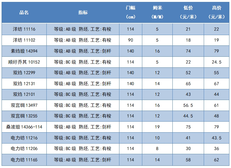 本周綢緞指數(shù)協(xié)作單位成交價格區(qū)間