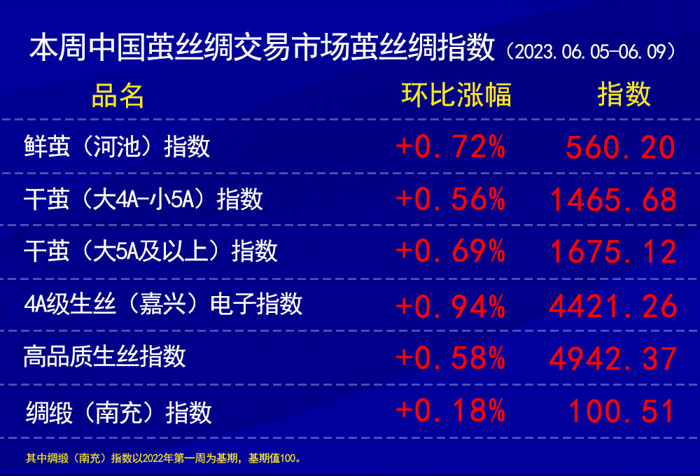 高品質(zhì)生絲指數(shù)上,本周,協(xié)作單位多數(shù)上調(diào)價格,部分仍維持原價加大出貨,購銷氛圍有所轉(zhuǎn)好。生絲指數(shù)環(huán)比上周有上調(diào)。