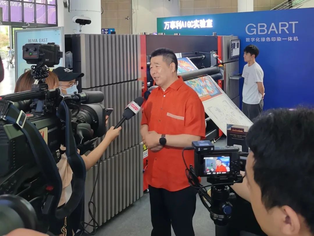在絲綢宣傳展場館的右側(cè),杭州萬事利公司展出的GBART數(shù)字化綠色印染一體機(jī)特別引人注目。它耗時(shí)8年研發(fā)而成,具備無污染、體積小、生產(chǎn)速度快等優(yōu)勢,融合數(shù)字化色彩管理技術(shù),使墨水與纖維精準(zhǔn)結(jié)合,實(shí)現(xiàn)絲、棉、毛、麻、再生纖維素纖維等面料在印染過程中節(jié)水99%以上,從而達(dá)到無污水排放。它可實(shí)現(xiàn)小批量快交付,破解行業(yè)庫存積壓痛點(diǎn),幫助紡織企業(yè)開創(chuàng)先銷售再生產(chǎn)經(jīng)營新模式。李建華董事長正在接受采訪。