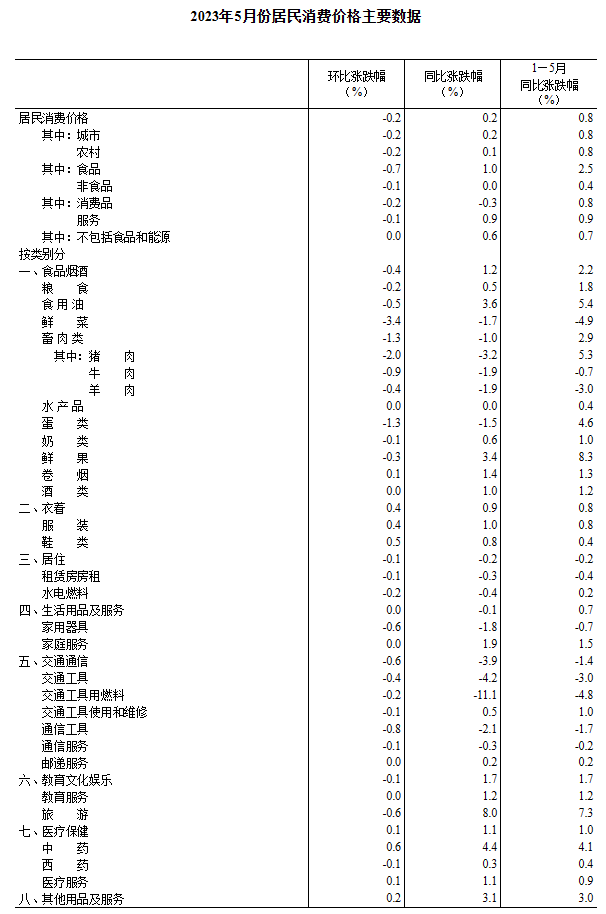 5月份,全國(guó)居民消費(fèi)價(jià)格環(huán)比下降0.2%。其中,城市下降0.2%,農(nóng)村下降0.2%;食品價(jià)格下降0.7%,非食品價(jià)格下降0.1%;消費(fèi)品價(jià)格下降0.2%,服務(wù)價(jià)格下降0.1%。