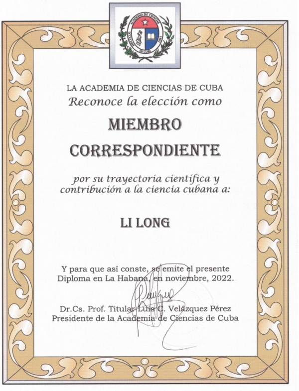 鑒于上述功績(jī)和成果,古巴科學(xué)院全體會(huì)議于2022年11月決定授予李龍教授古巴科學(xué)院外籍院士稱(chēng)號(hào)。