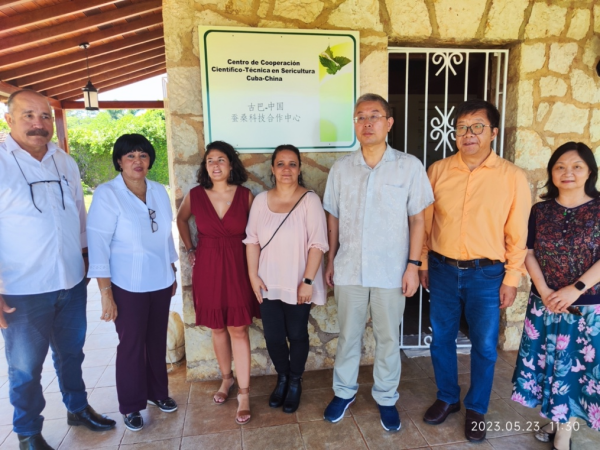 古巴科學(xué)院副院長(zhǎng)伊斯內(nèi)里·塔拉韋拉博士(左三)與中古蠶??萍己献黜?xiàng)目雙方項(xiàng)目成員合影