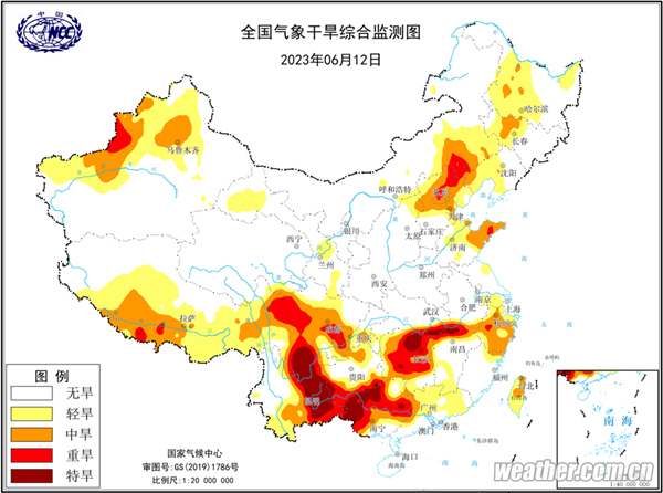 1月以來,云南全省平均降水量146.9毫米,較常年同期偏少46.2%,為1961年以來同期最少,同時(shí)大部地區(qū)氣溫較常年偏高,氣象干旱發(fā)展。上周,全省大部地區(qū)出現(xiàn)降雨過程,氣象干旱明顯緩和,但中東部地區(qū)仍維持較重氣象干旱,截至6月12日,云南東部部分地區(qū)仍有重旱甚至特旱。今起三天,云南降雨頻繁,將對(duì)緩解氣象干旱有利。