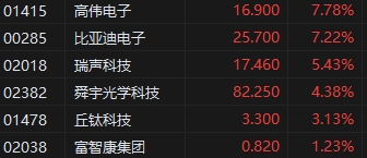 蘋果概念股普漲,高偉電子(16.9, 1.22, 7.78%)、比亞迪(257.8, 3.45, 1.36%)電子(25.7, 1.73, 7.22%)漲超7%,瑞聲科技(17.46, 0.90, 5.43%)漲超5%。消息面上,美股蘋果昨日收漲1.56%,每股183.79美元,為歷史最高收盤價且逼近新高。公司市值更是達到2.89萬億美元,離3萬億大關(guān)僅相距1%左右的漲幅。