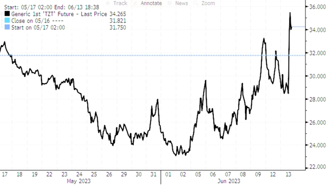 當(dāng)?shù)貢r(shí)間6月13日周二,歐洲大陸TTF基準(zhǔn)荷蘭天然氣期貨早盤刷新日低時(shí)日內(nèi)跌超9%,此后盤中跳漲,不但抹平跌幅,而且一度漲至36.675歐元,日內(nèi)漲幅超過(guò)18%、較日內(nèi)低位回漲略超過(guò)30%。