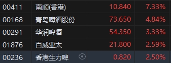 啤酒股集體上漲,南順(香港)(10.84, 0.74, 7.33%)漲超7%,青島啤酒漲近5%,華潤啤酒(54.35, 1.75, 3.33%)漲3%,百威亞太(21.8, 0.55, 2.59%)、香港生力啤(0.82, 0.02, 2.50%)漲2%。華西證券發(fā)布研究報(bào)告稱,目前啤酒行業(yè)龍頭公司PE估值均在30倍左右,行業(yè)估值水平處在10年P(guān)E估值分布的25%分位,已具備較高的配置價(jià)值。啤酒板塊后期上漲邏輯在于結(jié)構(gòu)升級(jí)與良好動(dòng)銷所支撐的穩(wěn)健基本面以及食飲板塊β整體提振帶來的估值提升。在異常高溫的背景下,6-8月為啤酒傳統(tǒng)消費(fèi)旺季,預(yù)計(jì)隨著啤酒動(dòng)銷旺季到來,板塊PE估值有望進(jìn)一步提升。