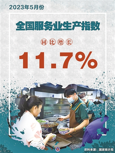 隨著經(jīng)濟(jì)社會(huì)全面恢復(fù)常態(tài)化運(yùn)行,服務(wù)需求持續(xù)釋放,帶動(dòng)服務(wù)業(yè)增長。5月,服務(wù)業(yè)生產(chǎn)指數(shù)同比增長11.7%,保持較快增長。加上5月假期效應(yīng)帶動(dòng)及上年基數(shù)較低的影響,接觸型服務(wù)業(yè)增長較快。5月,住宿和餐飲業(yè)生產(chǎn)指數(shù)同比增長39.5%。