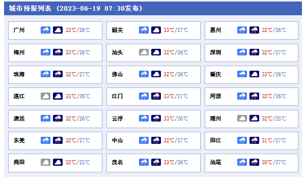 城市方面,廣州今天多云,有雷陣雨;氣溫26℃~33℃;相對濕度70%~95%;吹輕微的偏南風。