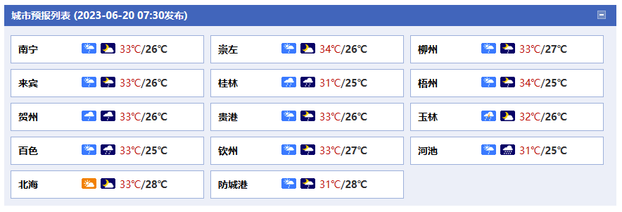 南寧市:今天白天,多云有陣雨,偏南風2~3級,最低氣溫26℃,最高氣溫33℃。