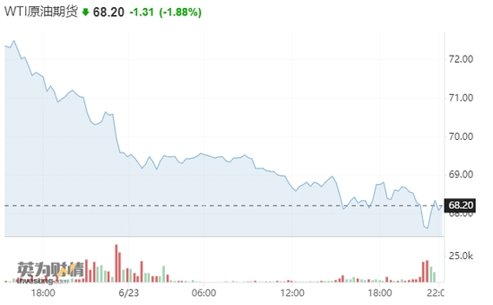 具體行情顯示,紐約商品交易所8月交貨的WTI原油期貨價格跌1.88%,報每桶68.20美元,日內(nèi)一度跌超3%;8月交貨的倫敦布倫特原油期貨價格下跌1.3%,現(xiàn)報73.12美元/桶,日內(nèi)一度跌超2.7%。昨日這兩大油價基準(zhǔn)分別跌了4.16%和3.86%。