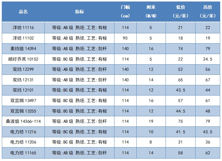 本周綢緞指數(shù)協(xié)作單位成交價格區(qū)間