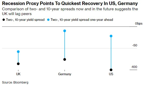 比較現(xiàn)在和未來的兩年期和10年期國債息差表明,英國將落后于其他國家
