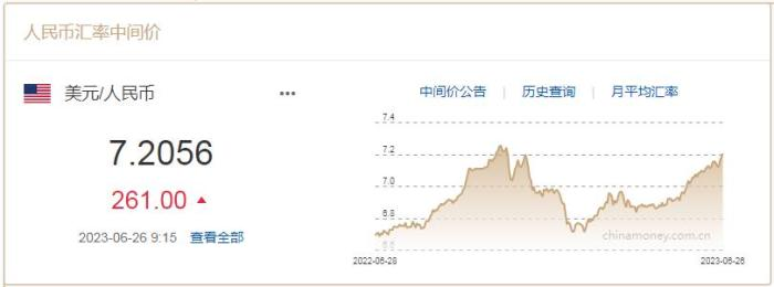 中國人民銀行授權(quán)中國外匯交易中心公布,6月26日人民幣對美元中間價報(bào)7.2056,下調(diào)261個基點(diǎn)。