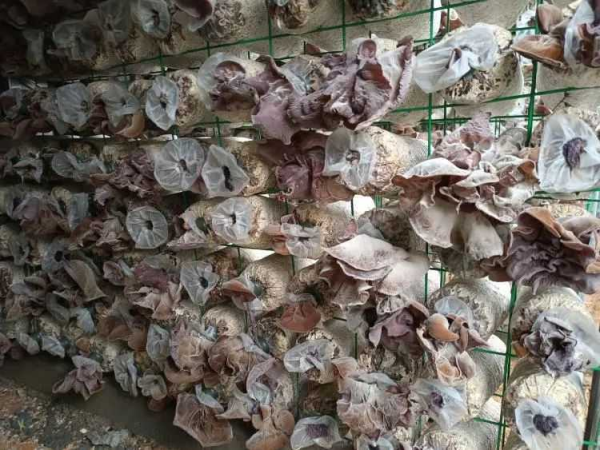 近日,在世行項目廣西河池市宜州區(qū)興偉種養(yǎng)專業(yè)合作社的桑枝食用菌大棚里,工人們抓緊采摘今年頭茬毛木耳。