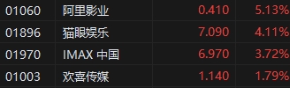 電影概念股逆勢上漲,阿里影業(yè)(0.41, 0.02, 5.13%)漲超5%,貓眼娛樂(7.09, 0.28, 4.11%)漲超4%,IMAX中國漲超3%,消息面上,據(jù)國家電影局初步統(tǒng)計(jì),2023年端午檔(6月22日至6月24日)電影票房為9.09億元,取得了影史端午檔票房第二的成績,觀影人次為2249萬,國產(chǎn)影片票房占比為80.08%。