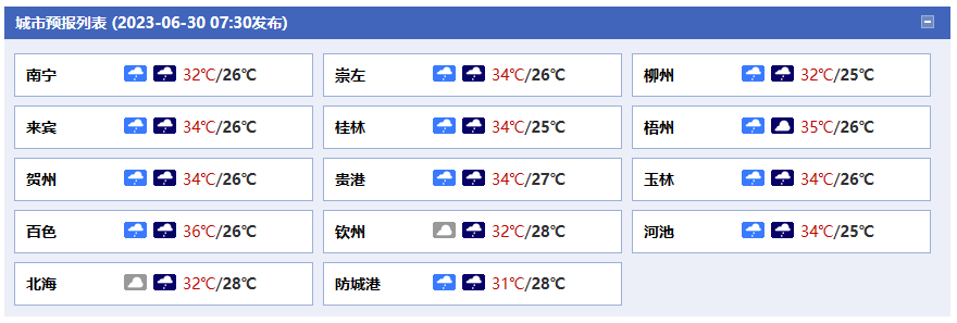 南寧市:今天白天到晚上,多云、局地有陣雨或雷雨,偏南風1~2級,最高氣溫35℃,最低氣溫26℃。