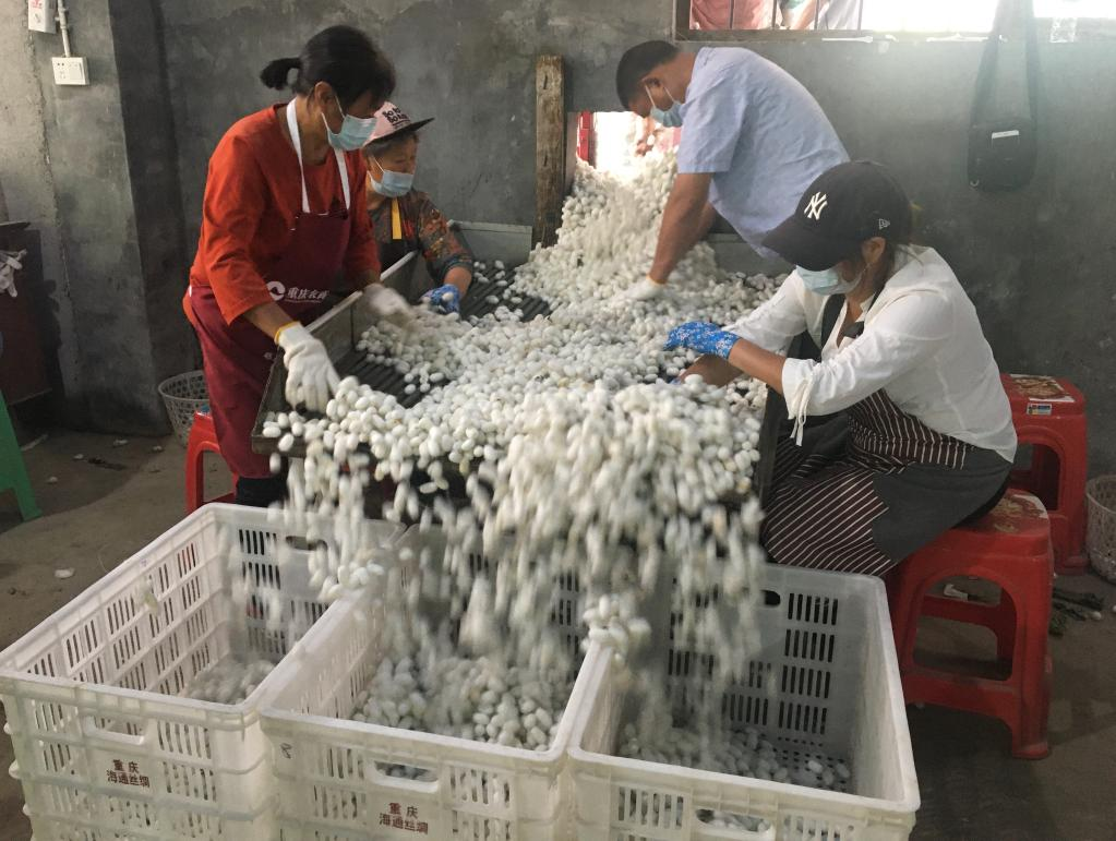 圖為工人們正在太極鎮(zhèn)蠶繭收購(gòu)站忙碌