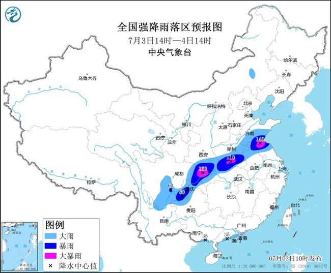預計,7月3日14時至4日14時,四川東北部和南部、云南東北部、重慶大部、貴州西北部、湖北西部、河南中南部、山東中南部、安徽北部、江蘇北部等地部分地區(qū)有大到暴雨,其中,河南西南部、山東南部、江蘇北部、四川東北部、重慶北部等地局地有大暴雨(100~160毫米)。上述部分地區(qū)伴有短時強降水(最大小時降雨量20~50毫米,局地可超過60毫米),局地有雷暴大風等強對流天氣。