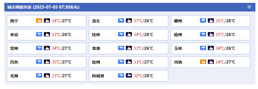 6日白天到7日晚上,全區(qū)多云到晴、局地有陣雨或雷雨。左右江河谷最高氣溫35~37℃、局地38℃以上。