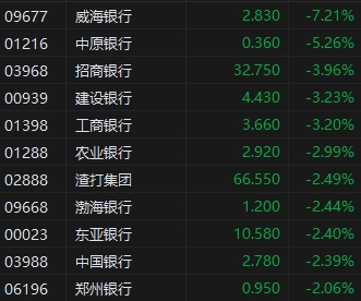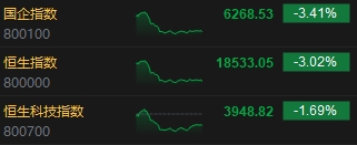 7月6日消息,港股全天震蕩下挫。截至收盤,恒生指數(shù)(18533.049, -577.33, -3.02%)大跌3.02%報18533.05點重挫近600點,創(chuàng)逾一個月新低,恒生科技指數(shù)(3948.82, -67.71, -1.69%)跌1.69%,國企指數(shù)跌3.41%。盤面上,內銀股多數(shù)下挫,招商銀行(32.75, -1.35, -3.96%)跌超3%,建設銀行(4.43, -0.15, -3.23%)、農(nóng)業(yè)銀行(2.92, -0.09, -2.99%)、工商銀行(3.66, -0.12, -3.20%)等紛紛下跌,餐飲股、體育用品股、啤酒股紛紛走低,生物醫(yī)藥股亦全線下挫,中醫(yī)藥股方向領跌;汽車股午后回暖,華晨中國漲近15%,小鵬汽車漲4.5%。
