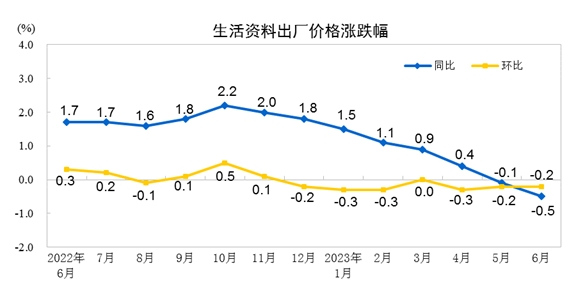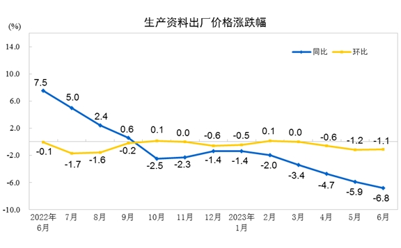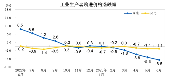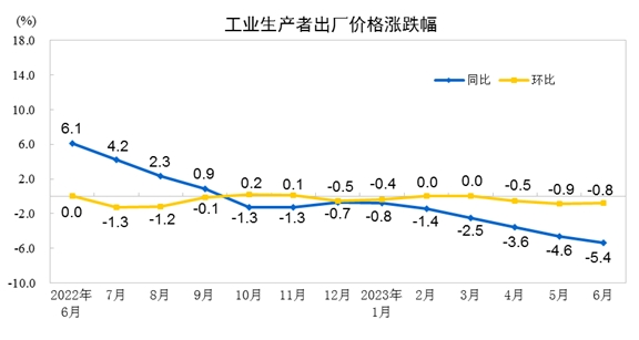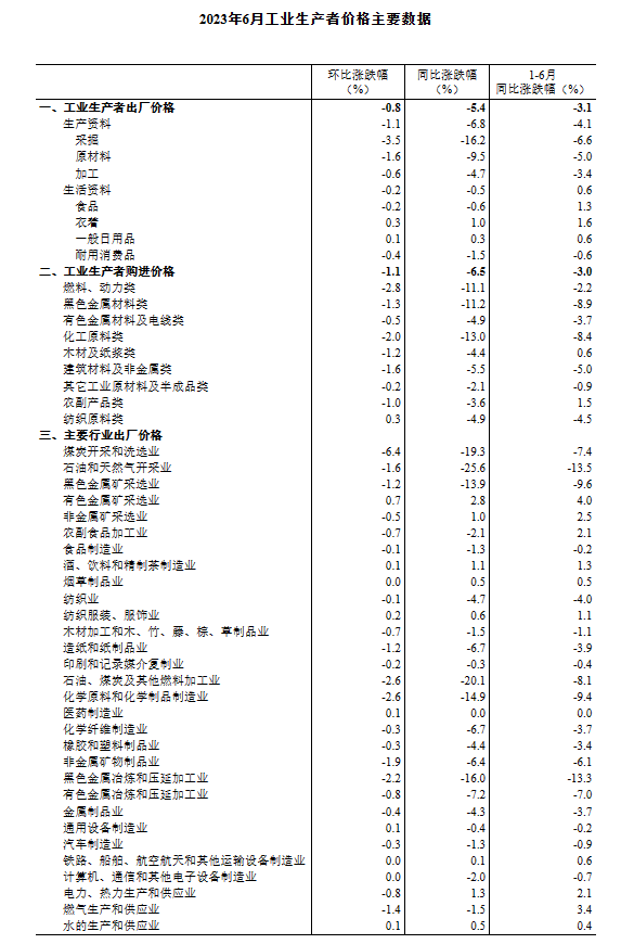 2023年6月份,全國工業(yè)生產(chǎn)者出廠價(jià)格同比下降5.4%,環(huán)比下降0.8%;工業(yè)生產(chǎn)者購進(jìn)價(jià)格同比下降6.5%,環(huán)比下降1.1%。上半年,工業(yè)生產(chǎn)者出廠價(jià)格比上年同期下降3.1%,工業(yè)生產(chǎn)者購進(jìn)價(jià)格下降3.0%。